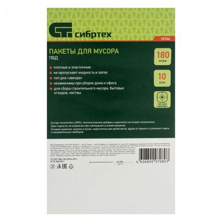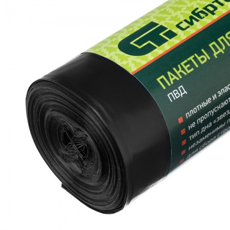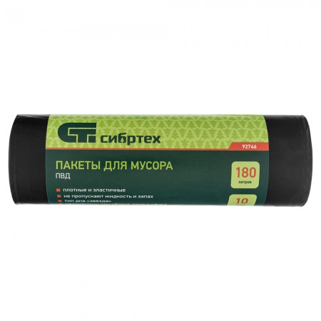 Пакеты для мусора 180 л x 10 шт, пвд, короткий ролик, тип дна "Звезда" Сибртех (92746)