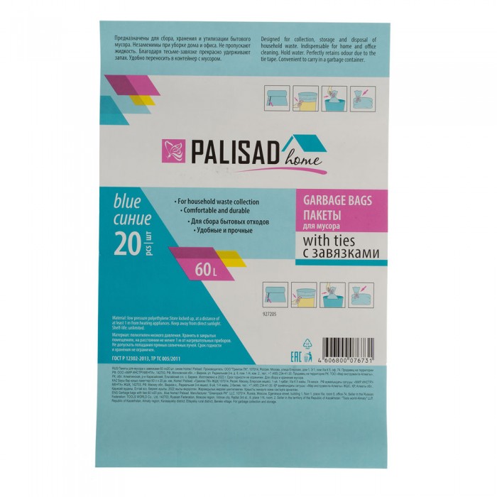 Пакеты для мусора с завязками 60 л x 20 шт., синие, Home Palisad (927205)