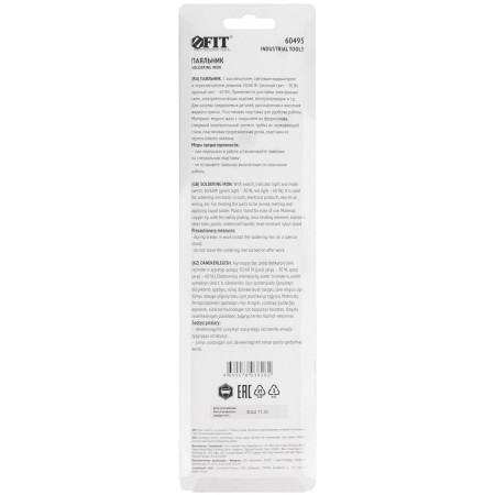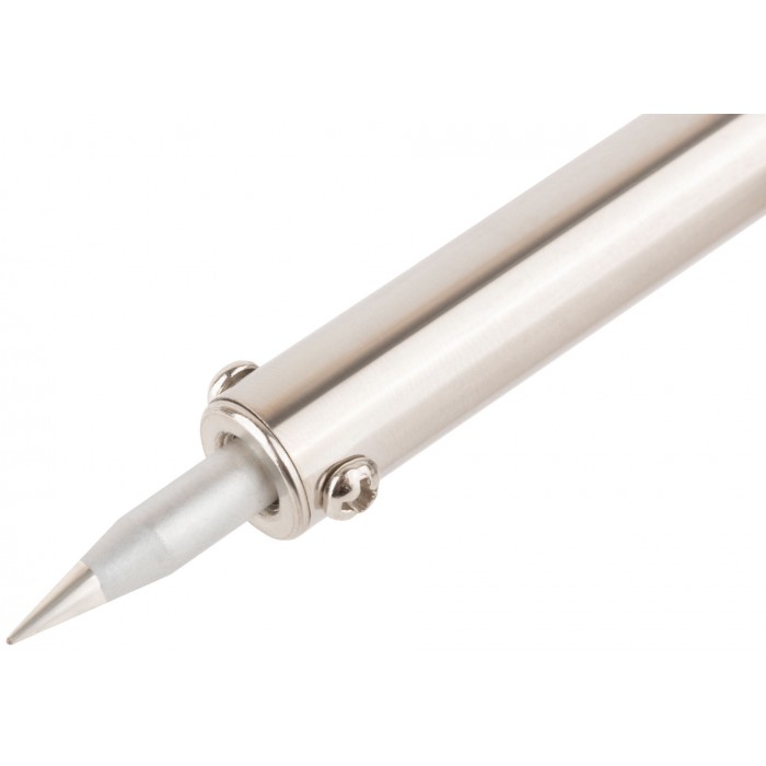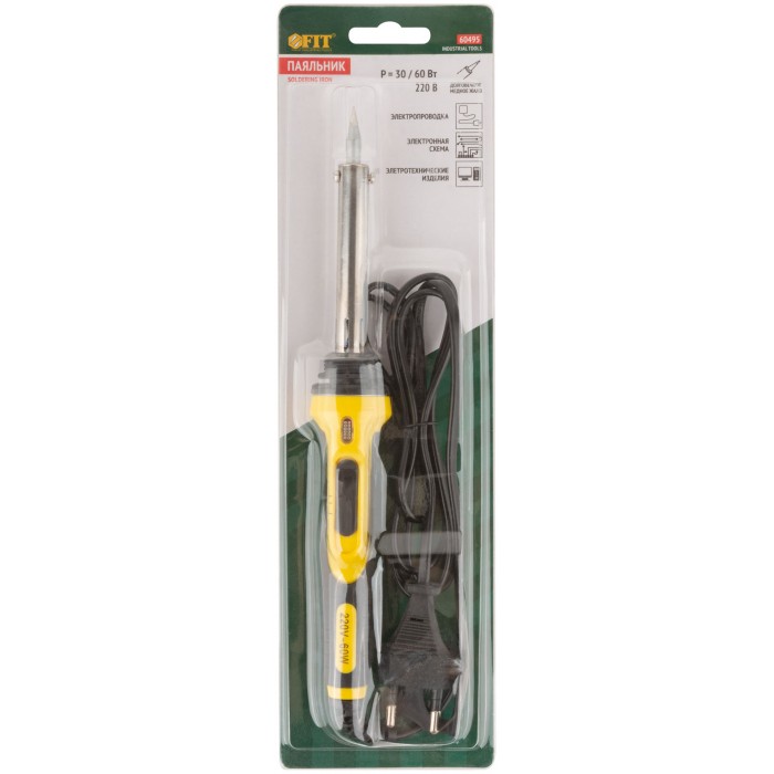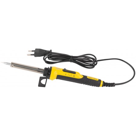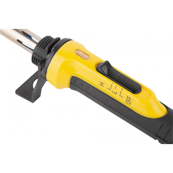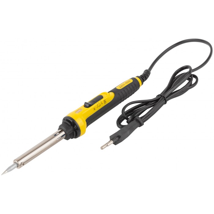 220 В. С выключателем, световым индикатором и переключателем режимов 30/60 Вт (зеленый свет - 30 Вт, красный свет 60 Вт). В комплекте с пластиковой подставкой. Материал: медное жало с покрытием из ферросплава, слюдяной нагревательный элемент, трубка из нержавеющей стали, пластиковая прорезиненная ручка, подставка из термостойкого нейлона. Упаковка: блистер.