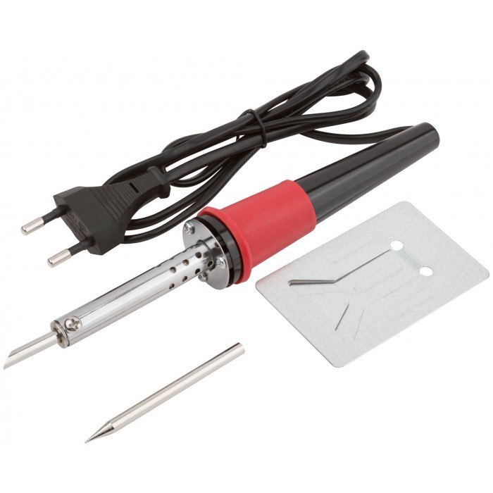 220 В. В комплекте: подставка для пояльника, два сменных жала (игорьчатое, скошенное). Материал: инструментальная сталь, ручка из термостойкого пластика, медное жало, с защитным хромированным покрытием.
