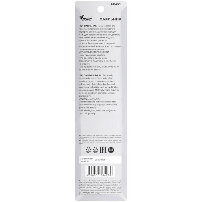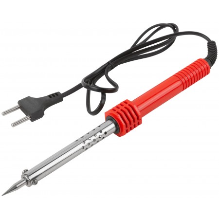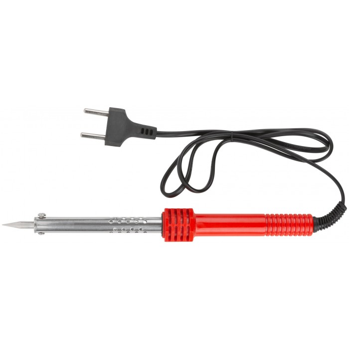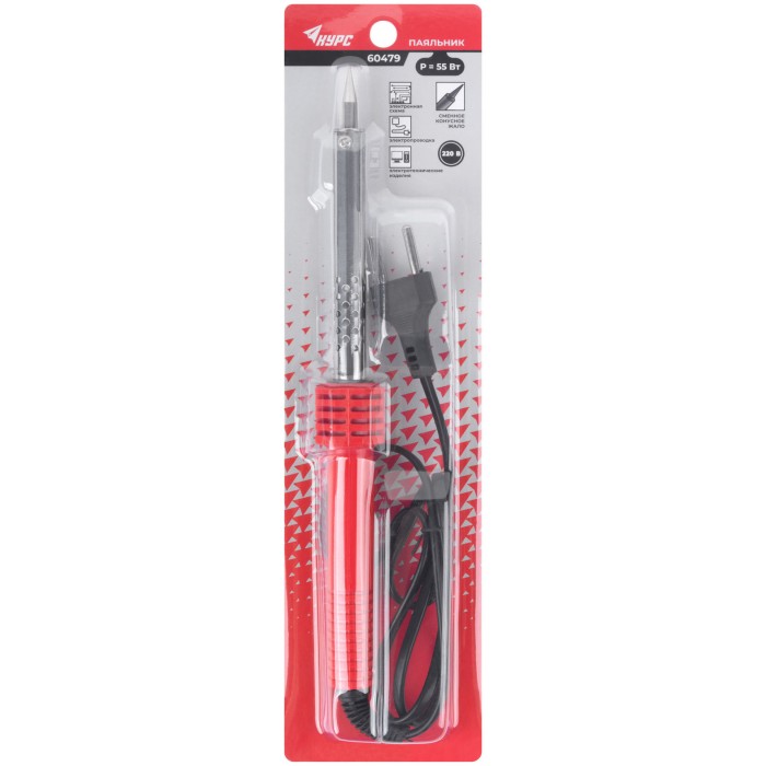 220 В. Материал: ручка из термостойкого пластика, слюдяной нагревательный элемент, жало из латуни с никелевым покрытием. Упаковка: блистер.