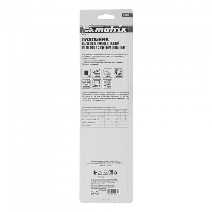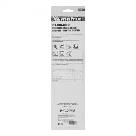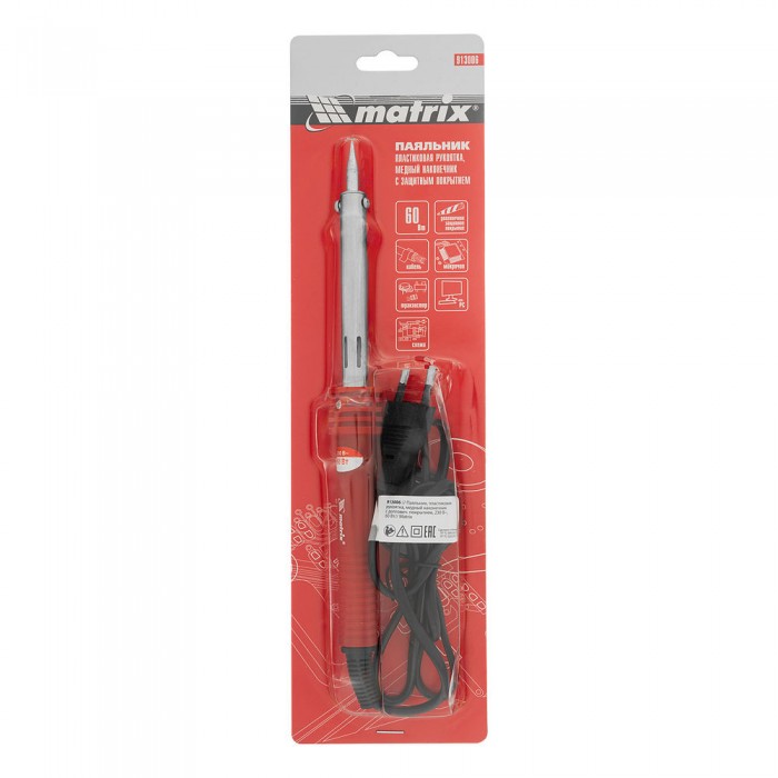 Паяльник, пластиковая рукоятка, медный наконечник с долговечным защитным покрытием, 220 В, 60 W Matrix (913006)