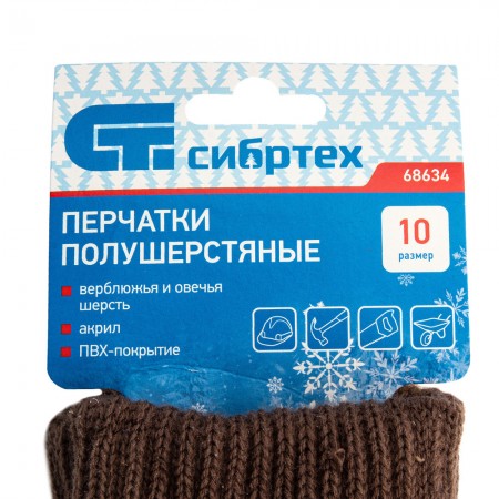 Перчатки трикотажные, двойные, полушерстяные, с ПВХ покрытием, Сибртех (68634)