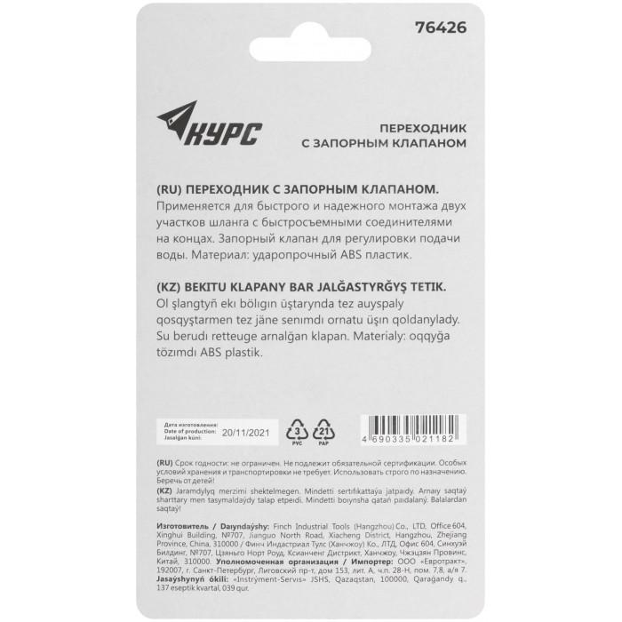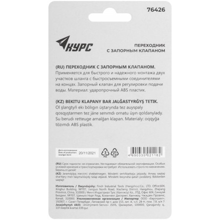 Переходник пластиковый с запорным клапаном (быстросъемное соединение)