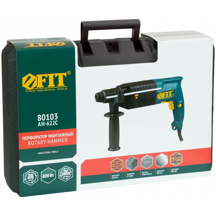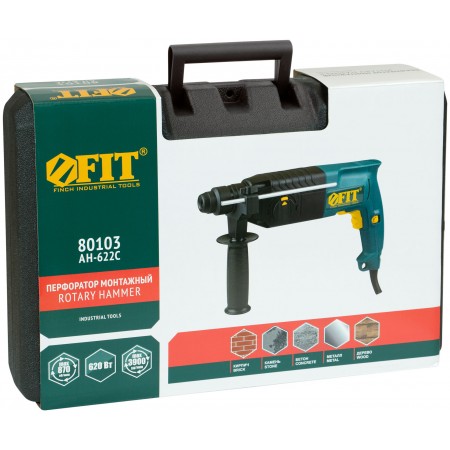 620 Вт; 0-870 об/мин; 0-3900 уд/мин; 2,6 Дж; 2,8А; Д/Б/М - 30/26/13 мм; 3,1кг; кейс. Три режима работы (сверление, сверление с ударом, долбление), режим поворота сменного инструмента, ограничитель частоты вращения, электрический реверс, универсальный патрон SDS-PLUS, электропневматическая функия удара, горизонтальное расположение двигателя, регулировка частоты вращения, фиксатор режима включения.