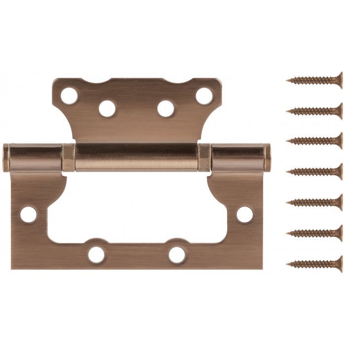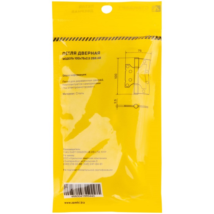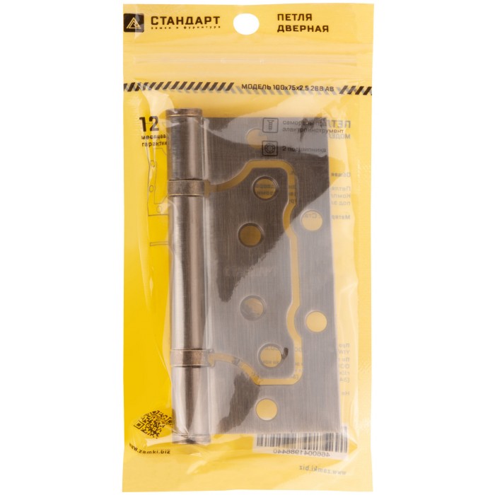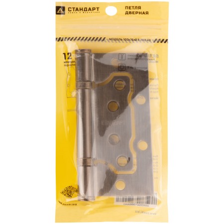 Петля дверная универсальная накладная, без врезки. 2 противоскрипных кольца, плоский колпачок. Предназначена для установки на левые и правые двери. Материал: сталь, гальваническое покрытие. Упаковка: п/э пакет с подвесом.
