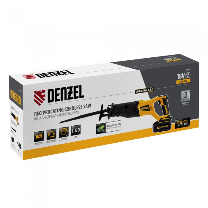 Пила сабельная аккумуляторная бесщет BRC-120, 18В Li-Ion Denzel (28460)