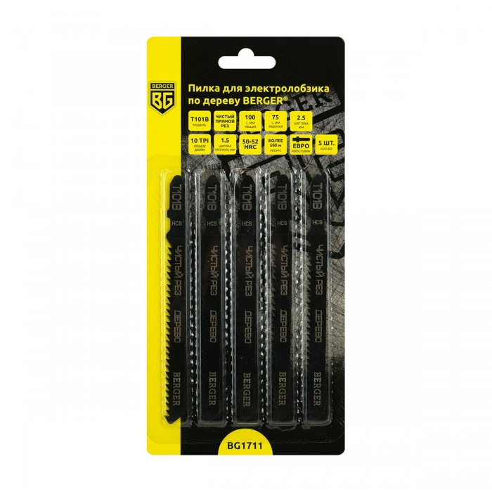 Пилка для электролобзика по дереву T101B, чистый рез (5 шт, шаг 2.5 мм, длина 100/75 мм) BERGER BG1711