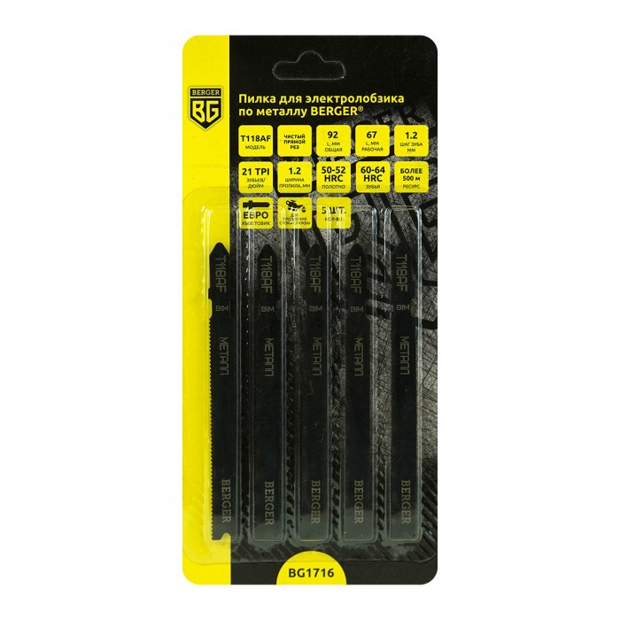 Пилка для электролобзика по металлу T118AF, би-металл, прямой рез (5 шт, шаг 1.2 мм, длина 92/67 мм) BERGER BG1716