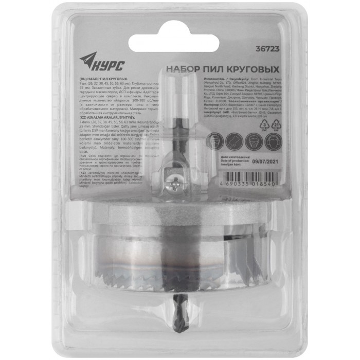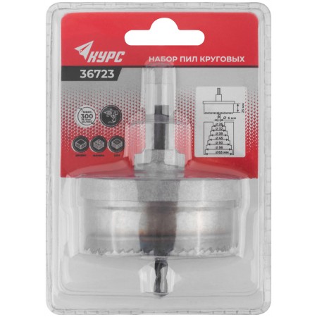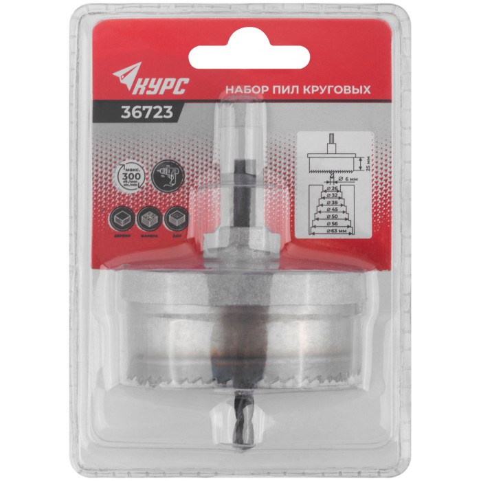 Для высверливания отверстий в древесине твер-дих и мягких пород, ДСП и фанере. В наборе 7 пил круговых: 26, 32, 38, 45, 50, 56 и 63 мм. Материал: инструментальная сталь. Упаковка: блистер