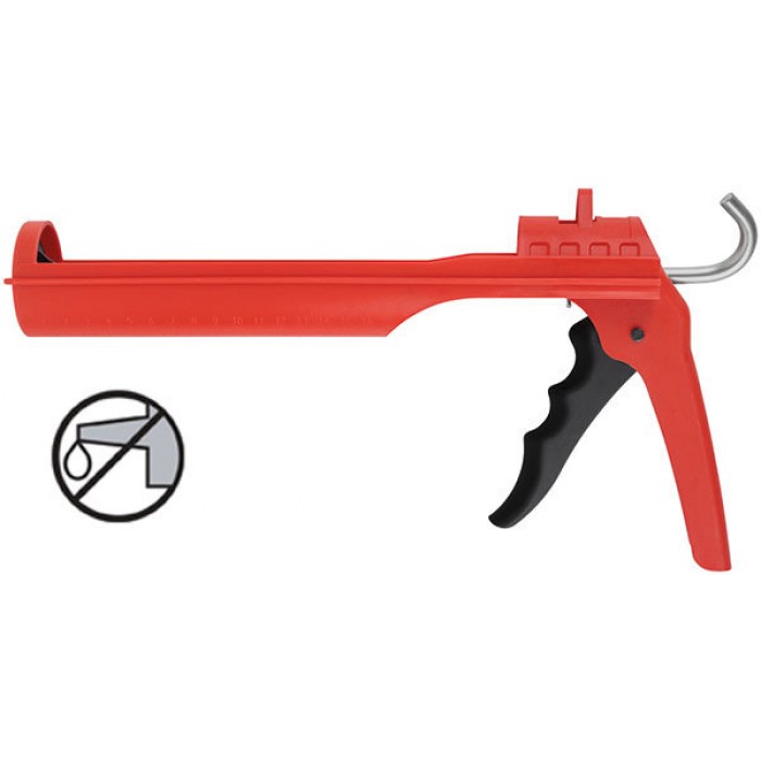 Полукорпусной. Для выдавливания герметика из стандартной емкости 310 мл. Противокапельная система. Материал: ручка из полиамида, усиленного фибергласом; корпус из полипропилена, усиленного фибергласом, шток из инструментальной стали.