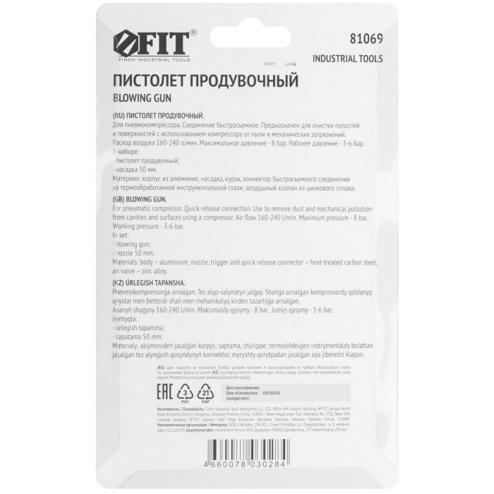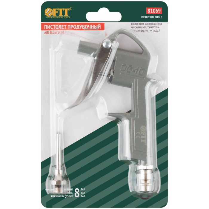 Для пневмокомпрессора. Соединение быстросъемное. Используется для очистки полостей и поверхностей от пыли и механических загрязнений. Максимальное давление - 8 бар. Рабочее давление 3-6 бар. КОМПЛЕКТАЦИЯ: пистолет продувочный, насадка 50 мм. Материал: корпус из алюминия; насадка, курок, коннектор быстросъемного соединения из инструментальной стали; воздушный клапан из цинкового сплава. Упаковка: блистер.