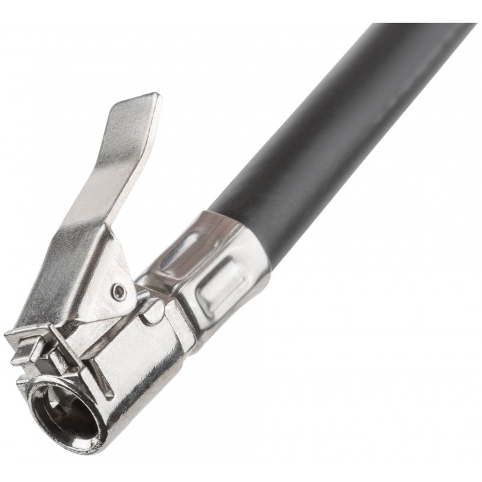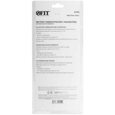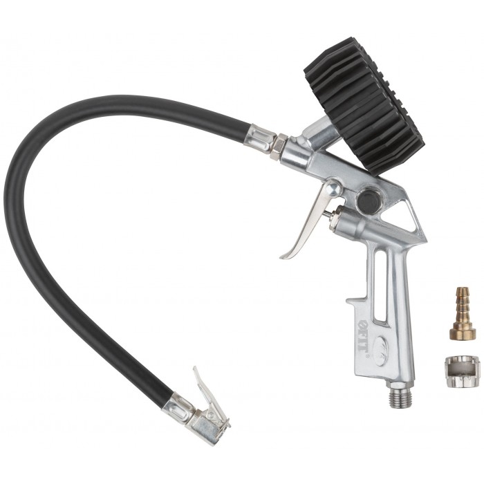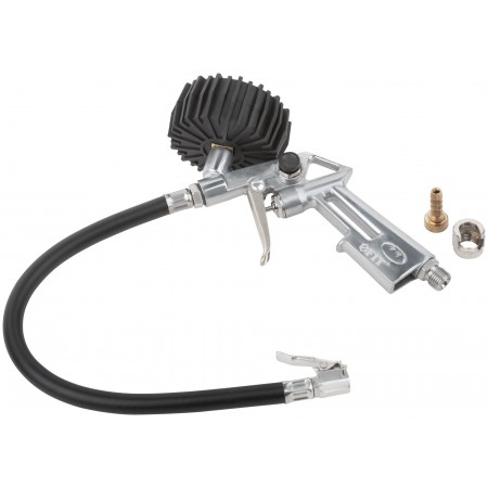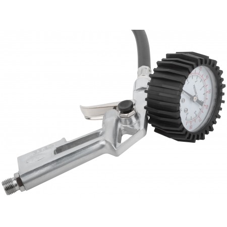 Пистолет с манометром, до 6 атм, 0,1 атм. Матери-ал: алюминий. Cоединение байонет. Измеритель-ная шкала до 6 атмосфер, с шагом 0,1 атмосферы, диаметр выходного отверстия (ниппель) 1/4”, по-перечное расположение манометра. Используется для контроля давления при подаче воздуха.