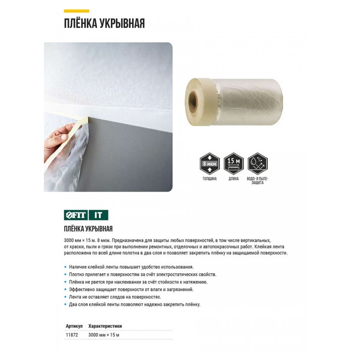 Пленка укрывная, с клейкой лентой, 8 мкм, 3000 мм х 15 м (11872)