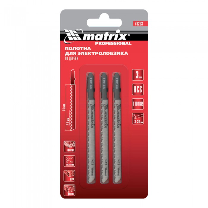 Полотна для электролобзика по дереву, 3 шт, T101BR, 75 х 2.5 мм, обратный зуб, HCS Matrix Professional