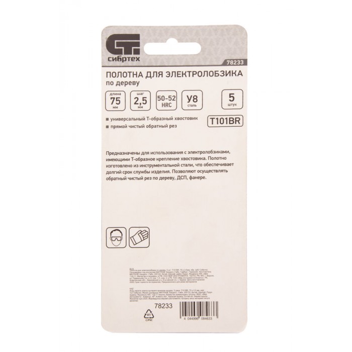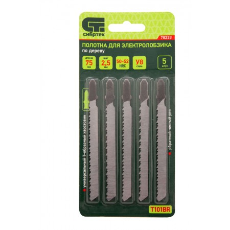 Полотна для электролобзика по дереву, 5 шт, T101BR, 75 х 2.5 мм, обратный зуб Сибртех
