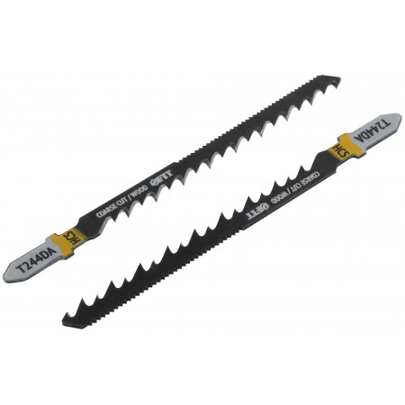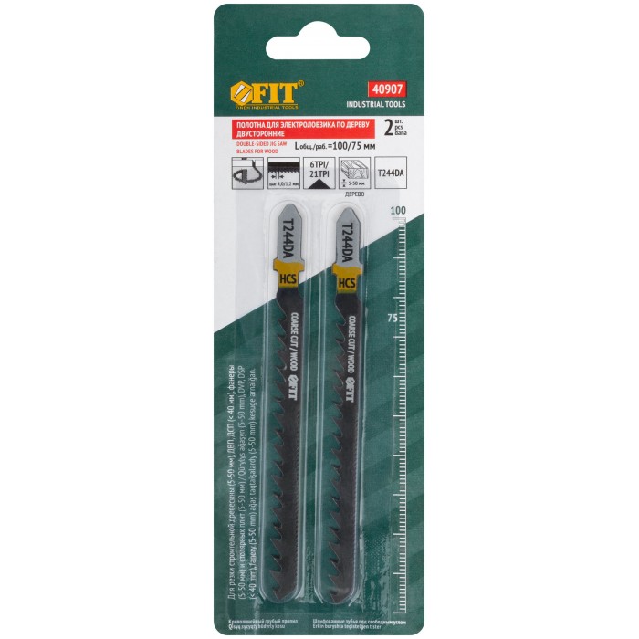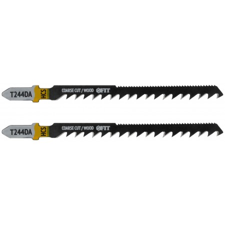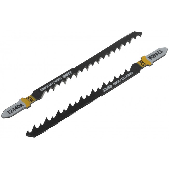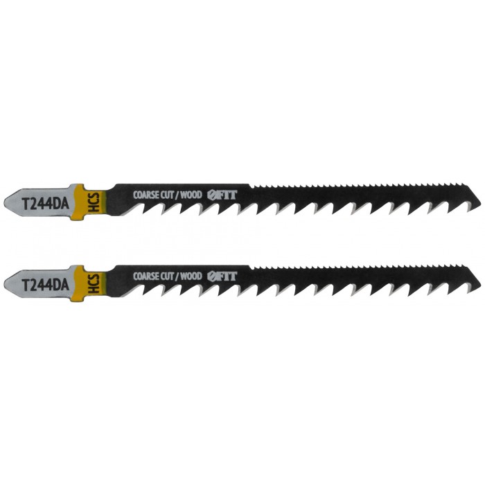 T244DA. Шлифованные зубья под свободным углом, задний угол заточен. Криволинейный грубый пропил. Дополнительный ряд зубьев с шагом 1,2 мм на обратной стороне полотна уменьшает радиус при пилении. Для резки строительной древесины, ДВП, ДСП, фанеры, столярных плит. Толщина реза: 5-50 мм. Материал: высокоуглеродистая инструментальная сталь. Упаковка: блистер.