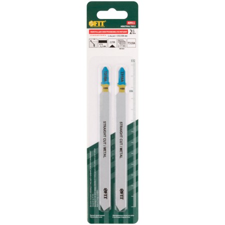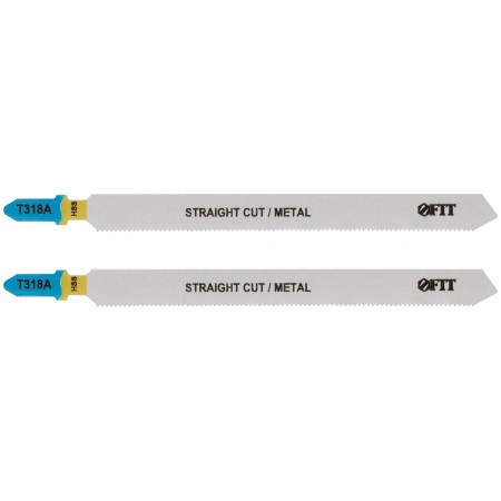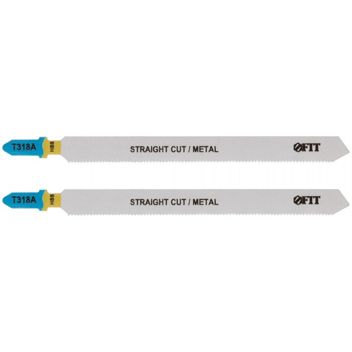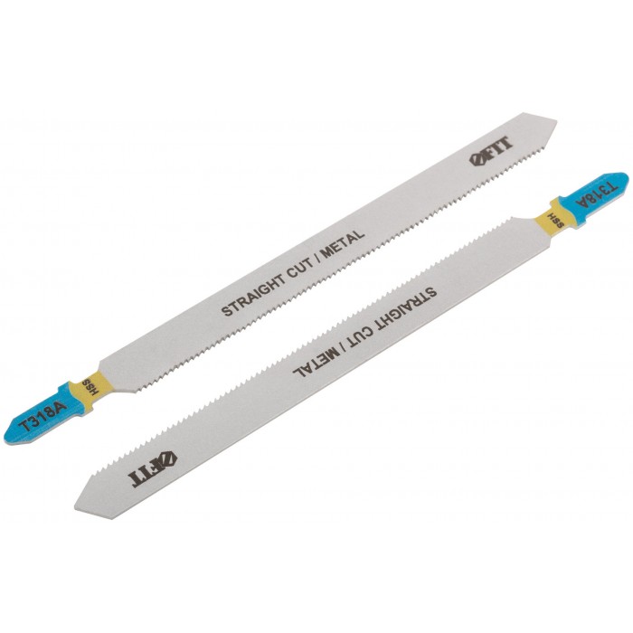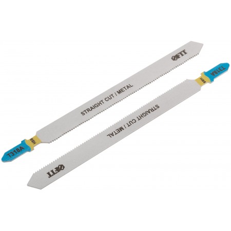 T318A. Профрезерованные волнистые зубья. Прямой тонкий пропил. Длинное полотно. Для резки листового металла толщиной 1-3 мм, труб и профилей (в том числе алюминиевых). Толщина реза: <65 мм. Материал: быстрорежущая (HSS) сталь. Упаковка: блистер.