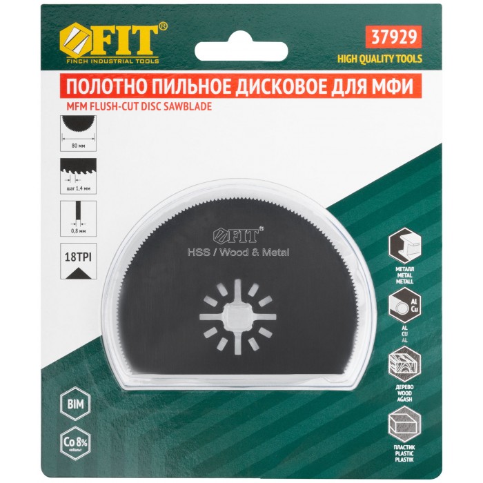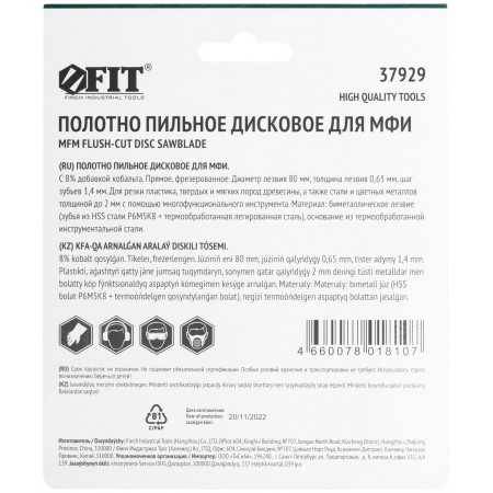 С 8% добавкой кобальта. Дисковое. Прямое. Фрезерованное. Диаметр лезвия 80 мм. Шаг зубьев 1,4 мм. Для резки стали, а также цветных металлов, твердых пород древесины и пластика. Материал: лезвие из быстрорежущей (HSS) стали Р6М5К8. Упаковка: блистер.