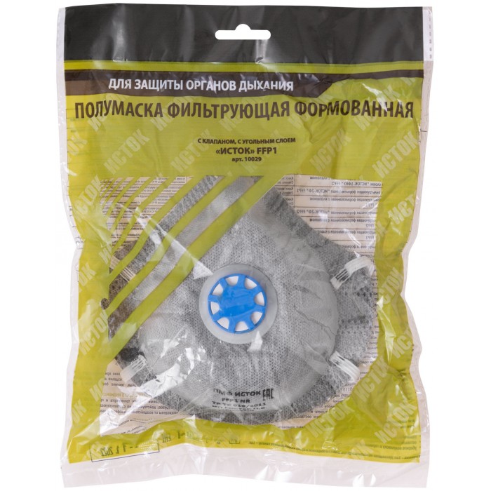 «ИСТОК». Полумаска фильтрующая, формованая, противоаэрозольная. С клапаном выдоха. Четырехслойный фильтр. Обеспечивает эффективную защиту органов дыхания от всех видов аэрозолей (пыль, дым, туман). Клапан выдоха препятствует накоплению под респиратором тепла и влаги, облегчает дыхание. Материал: полиэфирное полотно, угольный слой, мельтблаун, спанбонд. Упаковка: п/э пакет.