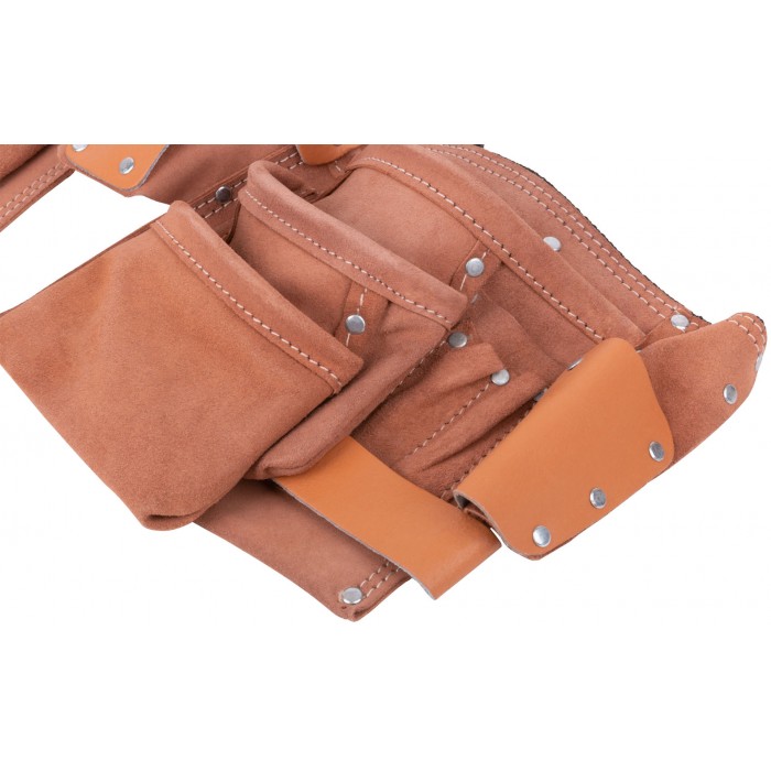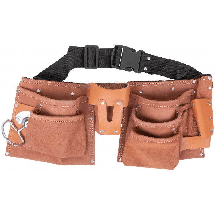10 отделений (2 подвесных), 1 петля для инструмента. Для переноса инструмента и крепежа во время проведения кровельных, монтажных, слесарных и других видов работ. Материал: кожа, нейлон, пластик, инструментальная сталь. Упаковка: П/Э пакет с картонным подвесом.