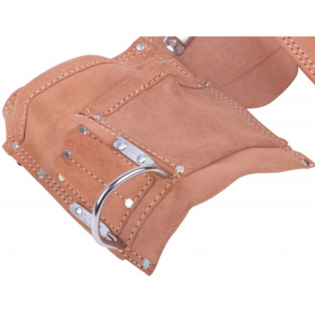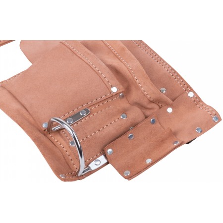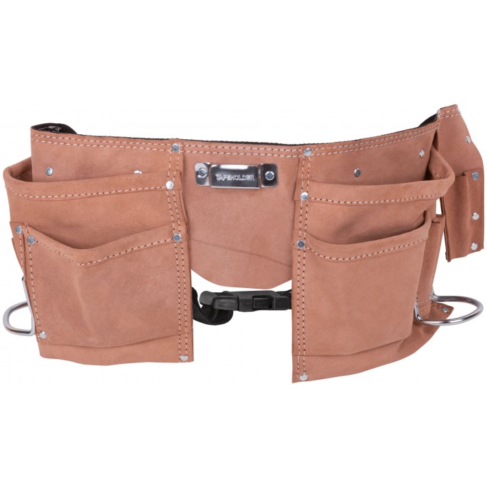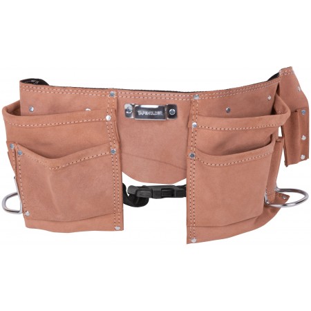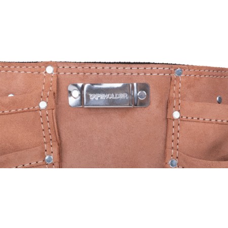 11 отделений, 2 петли для инструмента и держатель для рулетки. Для переноса инструмента и крепежа во время проведения кровельных, монтажных, слесарных и других видов работ. Материал: кожа, нейлон, пластик, инструментальная сталь. Упаковка: П/Э пакет с картонным подвесом.