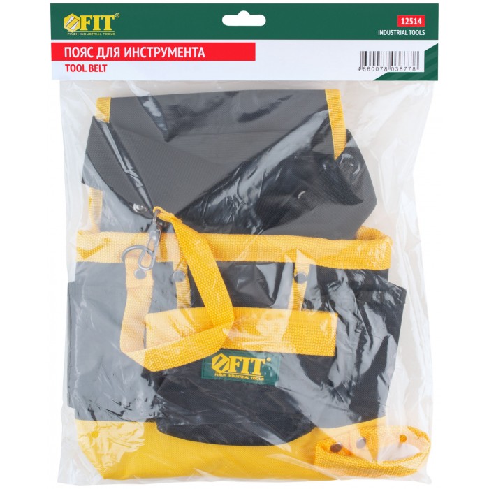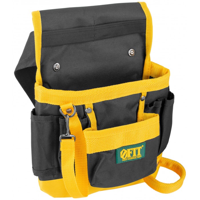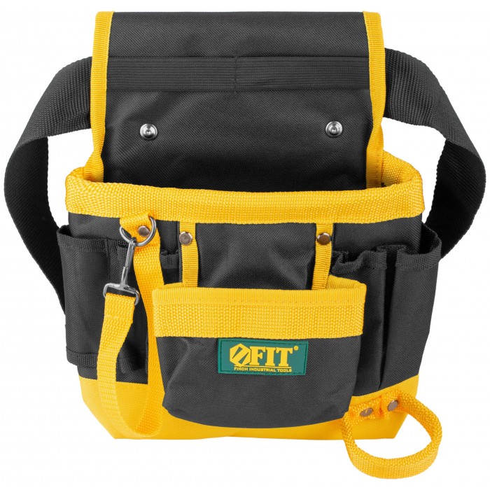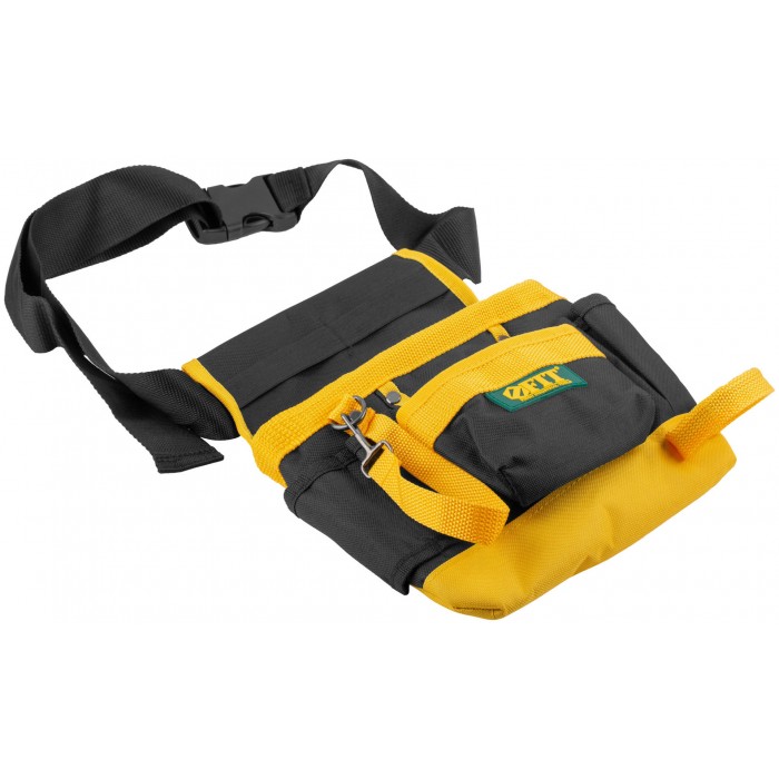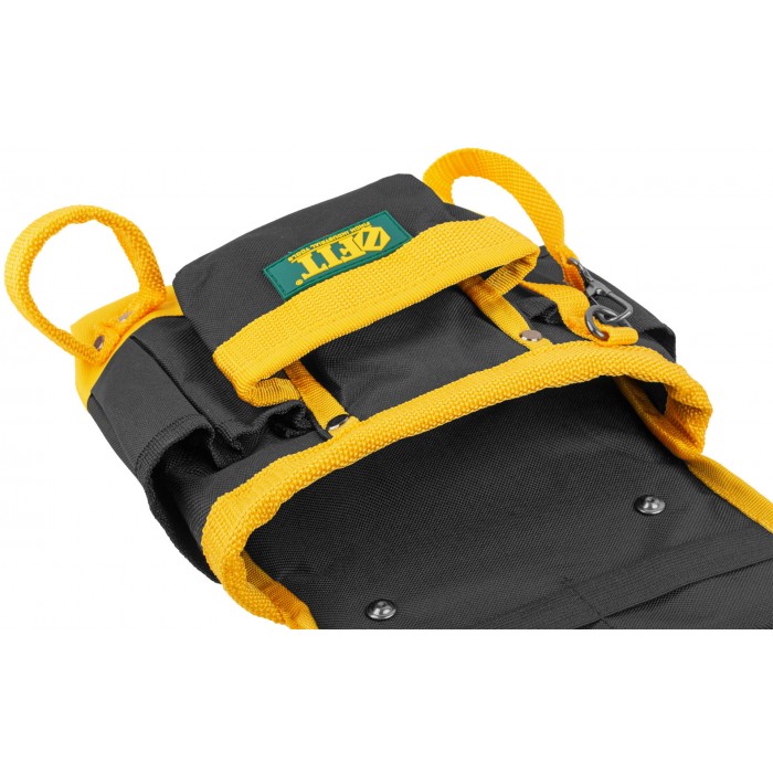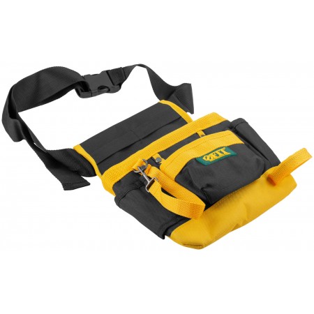 7 отделений, 1 петля для инструмента, 1 петля для клейкой ленты. Для переноски инструмента и крепежа во время проведения монтажных, слесарных, кровельных и других видов работ. Материал: полиэстер, пластик, инструментальная сталь. Упаковка: П/Э пакет с картонным подвесом.