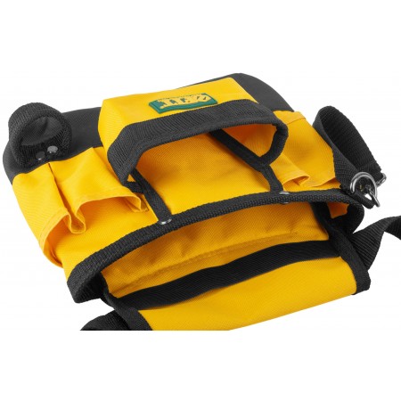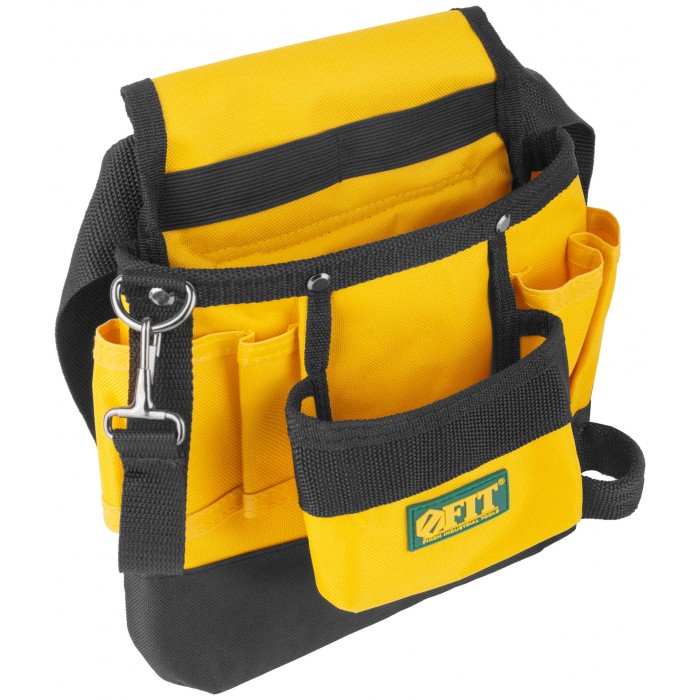 9 отделений, 1 петля для инструмента. Для переноски инструмента и крепежа во время проведения монтажных, слесарных, кровельных и других видов работ. Материал: полиэстер, пластик, инструментальная сталь. Упаковка: П/Э пакет с картонным подвесом.