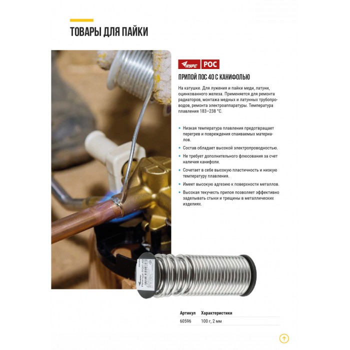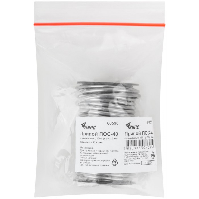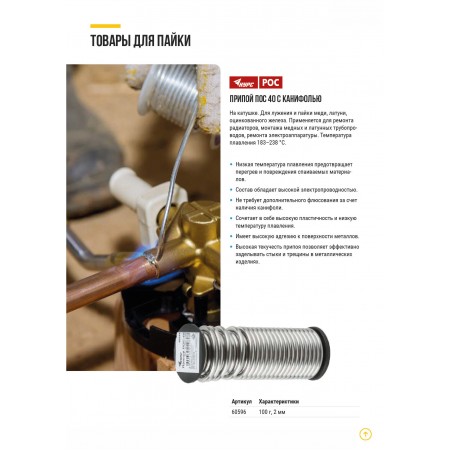 Припой ПОС 40 с канифолью, проволока диаметр 2 мм, на катушке, 100 гр. (60596)