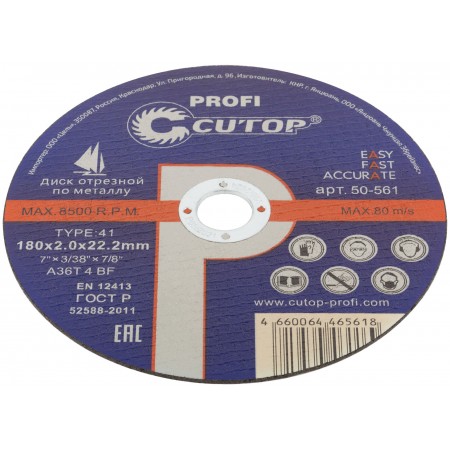 Профессиональный диск отрезной по металлу и нержавеющей стали Cutop Profi Т41-180 х 2,0 х 22,2 мм (50-561)