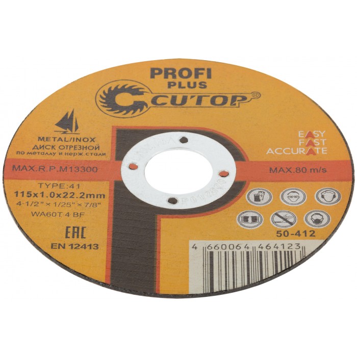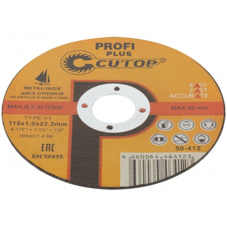 CUTOP Profi PLUS. Использованы уникальные технологии производства. Профессиональный отрезной диск для промышленного использования на основе монокристаллического электрокорунда, который улучшает КПД диска и позволяет увеличить количество резов в несколько раз. Предназначен для резки металла и нержавеющей стали. Для углошлифовальных машин. Посадочный диаметр 22,2 мм.