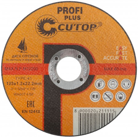 CUTOP Profi PLUS. Использованы уникальные технологии производства. Профессиональный отрезной диск для промышленного использования на основе монокристаллического электрокорунда, который улучшает КПД диска и позволяет увеличить количество резов в несколько раз. Предназначен для резки металла и нержавеющей стали. Для углошлифовальных машин. Посадочный диаметр 22,2 мм.