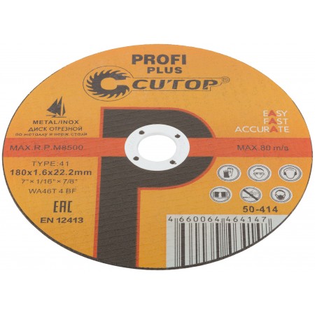 CUTOP Profi PLUS. Использованы уникальные технологии производства. Профессиональный отрезной диск для промышленного использования на основе монокристаллического электрокорунда, который улучшает КПД диска и позволяет увеличить количество резов в несколько раз. Предназначен для резки металла и нержавеющей стали. Для углошлифовальных машин. Посадочный диаметр 22,2 мм.