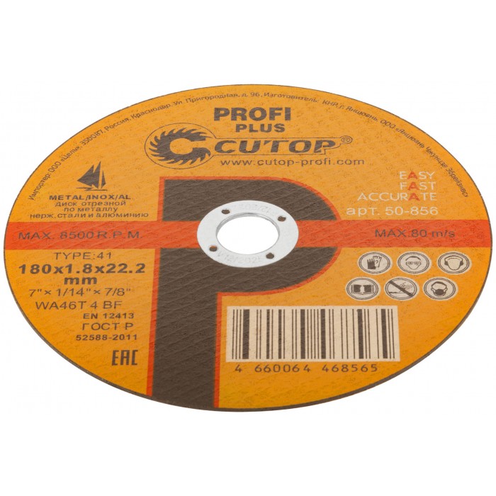 CUTOP Profi PLUS. Использованы уникальные технологии производства. Профессиональный отрезной диск для промышленного использования на основе монокристаллического электрокорунда, который улучшает КПД диска и позволяет увеличить количество резов в несколько раз. Предназначен для резки металла и нержавеющей стали. Для углошлифовальных машин. Посадочный диаметр 22,2 мм.