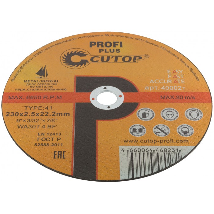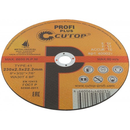CUTOP Profi PLUS. Использованы уникальные технологии производства. Профессиональный отрезной диск для промышленного использования на основе монокристаллического электрокорунда, который улучшает КПД диска и позволяет увеличить количество резов в несколько раз. Предназначен для резки металла и нержавеющей стали. Для углошлифовальных машин. Посадочный диаметр 22,2 мм.