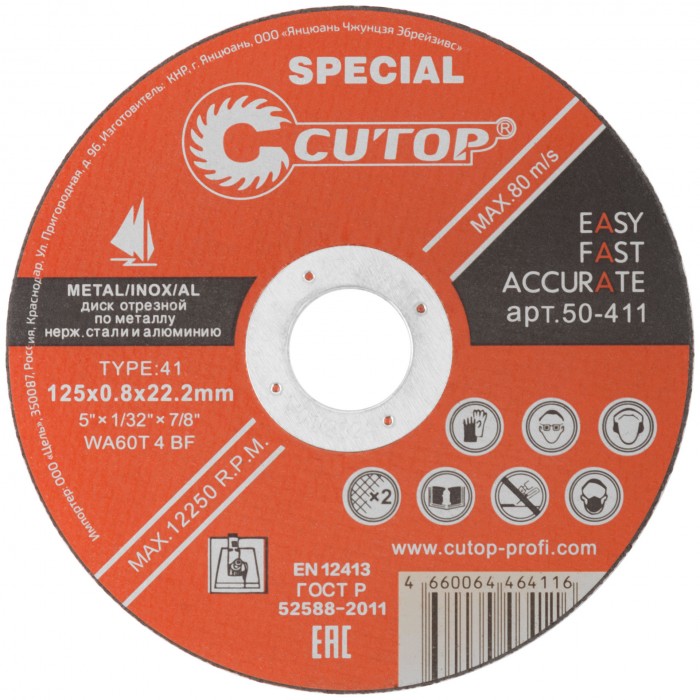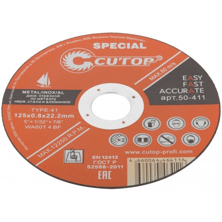 Профессиональный специальный диск отрезной по металлу, нержавеющей стали и алюминию Cutop Special Т41-125 х 0,8 х 22,2 мм (50-411)