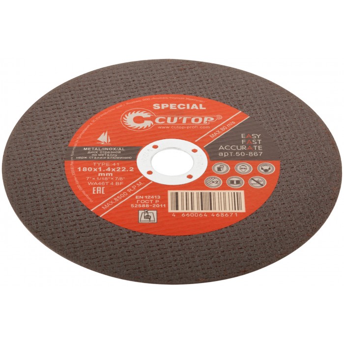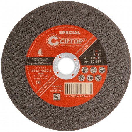 Профессиональный специальный диск отрезной по металлу, нержавеющей стали и алюминию Cutop Special, Т41-180 х 1,4 х 22,2 мм (50-867)