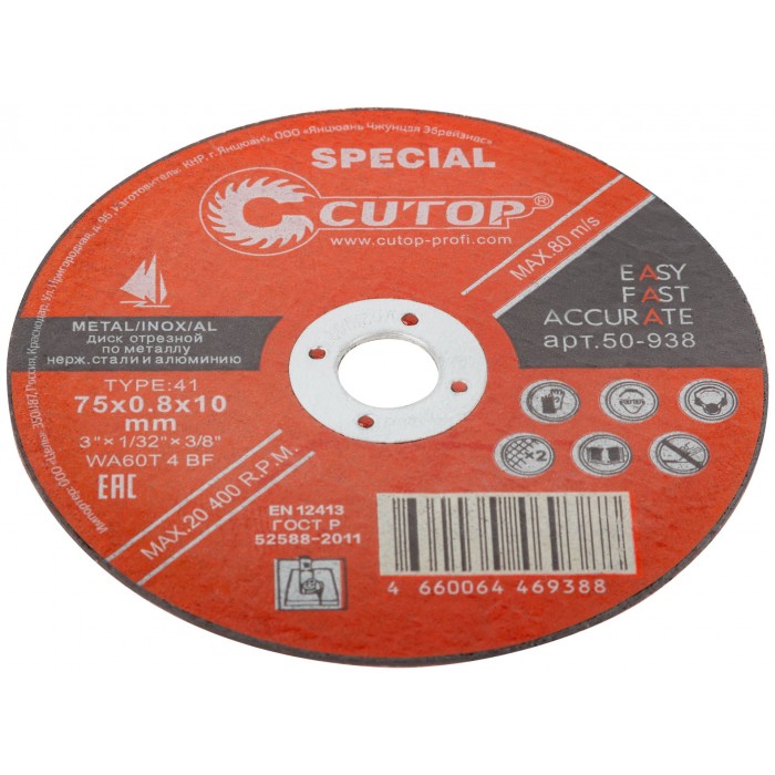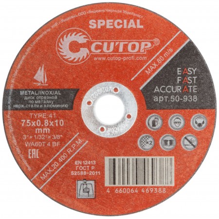 Профессиональный специальный диск отрезной по металлу, нержавеющей стали и алюминию Cutop Special, Т41-75 х 0,8 х 10,0 мм (50-938)