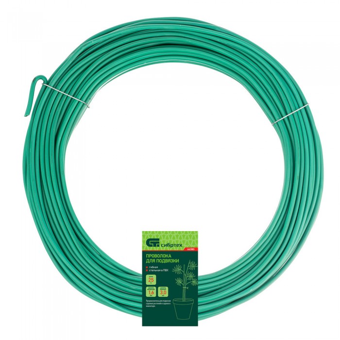 Проволока для подвязки, стальная в ПВХ (зеленый) 25 м, внутр. 1.6 мм / внеш. 3 мм Сибртех (64380)