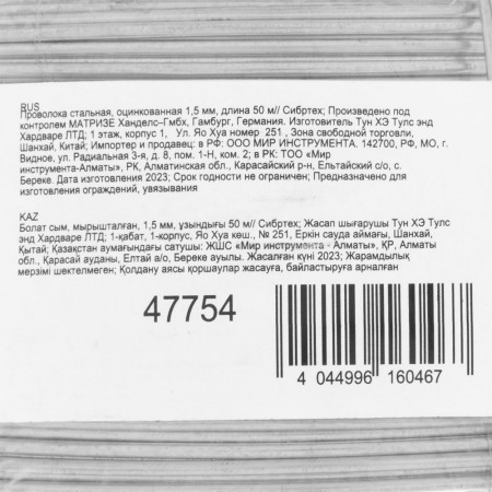 Проволока стальная, оцинкованная 1.5 мм, длина 50 м Сибртех (47754)