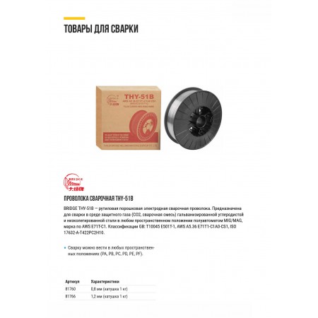 Проволока сварочная флюсовая THY-51B "Bridge" 0,8 мм (катушка 1 кг) (81760)