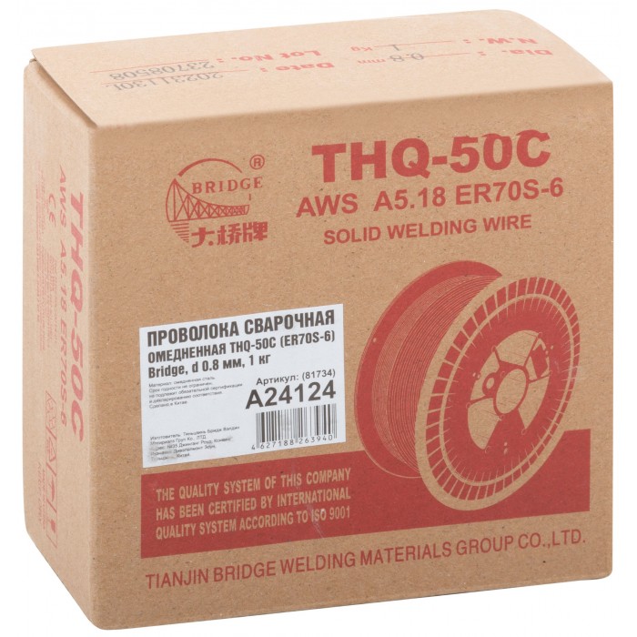 BRIDGE THQ-50C - омеднённая сварочная проволока для полуавтоматических сварочных аппаратов. Аналог СВ08Г2С. Соответствует ГОСТ 2246-70, имеет классификации GB: ER50-6, AWS: ER70S-6, JIS: YGW12 и сертификат НАКС. Предназначена для сварки конструкционных нелегированных и низколегированных сталей с пределом текучести до 500 МПа. Высококачественное омеднение и отсутствие овальности обеспечивает отличное скольжение. Сварку можно вести в любых пространственных положениях (PA, PB, PC, PD, PE, PF). Атмосфера сварки: углекислый газ, инертный газ. Материал: сталь.