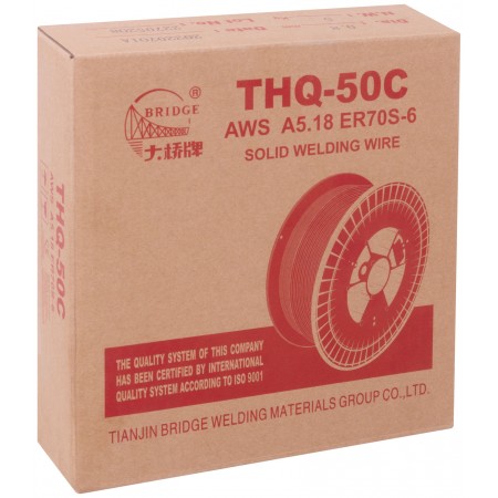 BRIDGE THQ-50C - омеднённая сварочная проволока для полуавтоматических сварочных аппаратов. Аналог СВ08Г2С. Соответствует ГОСТ 2246-70, имеет классификации GB: ER50-6, AWS: ER70S-6, JIS: YGW12 и сертификат НАКС. Предназначена для сварки конструкционных нелегированных и низколегированных сталей с пределом текучести до 500 МПа. Высококачественное омеднение и отсутствие овальности обеспечивает отличное скольжение. Сварку можно вести в любых пространственных положениях (PA, PB, PC, PD, PE, PF). Атмосфера сварки: углекислый газ, инертный газ. Материал: сталь.