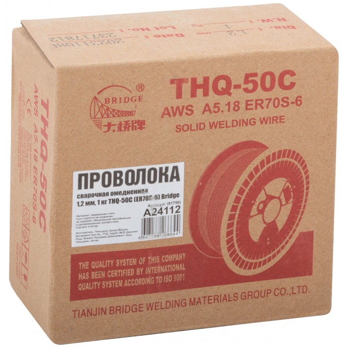 BRIDGE THQ-50C - омеднённая сварочная проволока для полуавтоматических сварочных аппаратов. Аналог СВ08Г2С. Соответствует ГОСТ 2246-70, имеет классификации GB: ER50-6, AWS: ER70S-6, JIS: YGW12 и сертификат НАКС. Предназначена для сварки конструкционных нелегированных и низколегированных сталей с пределом текучести до 500 МПа. Высококачественное омеднение и отсутствие овальности обеспечивает отличное скольжение. Сварку можно вести в любых пространственных положениях (PA, PB, PC, PD, PE, PF). Атмосфера сварки: углекислый газ, инертный газ. Материал: сталь.