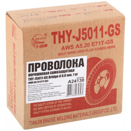 BRIDGE THY-J5011-GS - сварочная cамозащитная порошковая проволока. Классификации: GB:T10045 T49ZT11-1NSA AWS A5.20 E71T-GS. Предназначена для однопроходной сварки наружных неответственных стальных конструкций, с пределом прочности до 500 МПа. Применяется на открытых площадках, когда применение защитного газа (СО2,сварочная смесь) по погодным условиям невозможно или когда защитный газ не доступен. Сварка позиций: PA, PB, PC, PD, PE, PF.