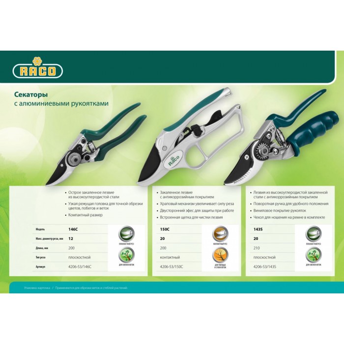 Секаторы RACO созданы для садоводов-любителей. Высококачественные материалы обеспечивают чистый рез и являются гарантией длительного срока службы изделия. А алюминиевые ручки делают инструмент легким.