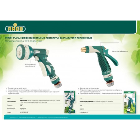 Поливочные пистолеты-распылители RACO Profi Plus это продукт объединения новейших технологий с современным дизайном, конечным результатом которого являются инструменты класса ″люкс″. Обладают наивысшим качеством, самым длительным сроком службы и уровнем комфорта в использовании.
