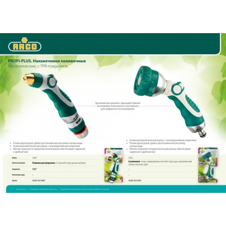 Поливочные пистолеты-распылители RACO Profi Plus это продукт объединения новейших технологий с современным дизайном, конечным результатом которого являются инструменты класса ″люкс″. Обладают наивысшим качеством, самым длительным сроком службы и уровнем комфорта в использовании.