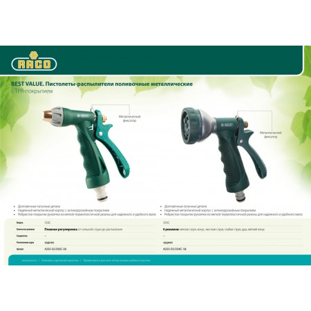 Поливочные пистолеты-распылители RACO Best Value – это оптимальное сочетание цены и качества. Надёжны в работе, служат долго, комфортны в использовании.