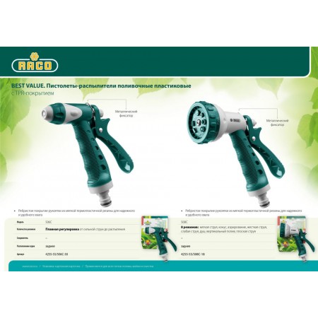 Поливочные пистолеты-распылители RACO Best Value – это оптимальное сочетание цены и качества. Надёжны в работе, служат долго, комфортны в использовании.